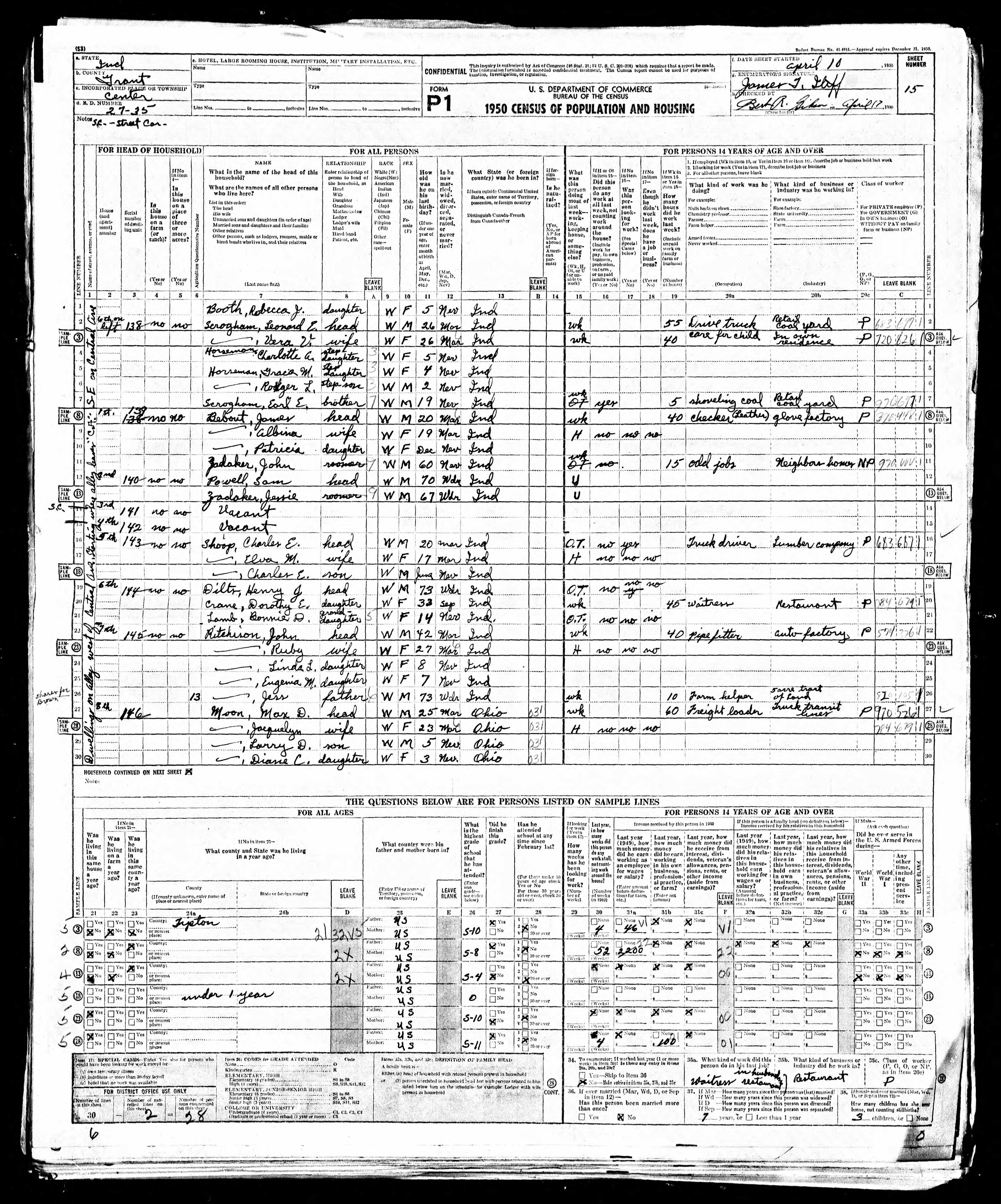 [4] NARA Pub: 43290879 Roll: 3910 Page: 17 ED: 27-35 Sheet: 15 Enumerated: 10 Apr 1950 Transcript ID is dbid=9999&iid=hjsc_13Image Transcript Ln Hhold Given Surname Relation Gender Race BirthDate Age Status BirthPlace BirthPlace