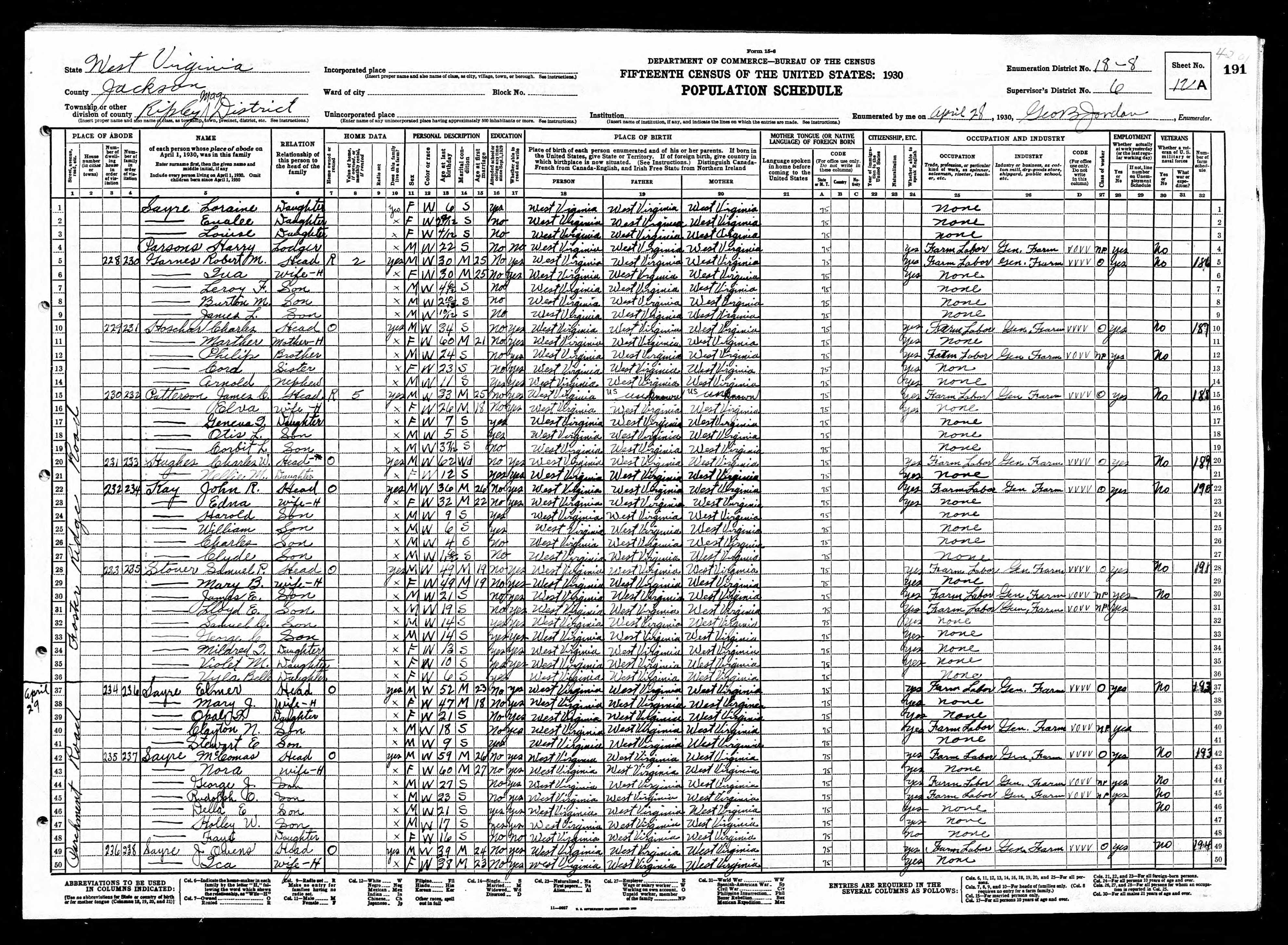 96227Otho CSayreHeadMaleWhite189139MarriedWest VirginiaWest VirginiaWest VirginiaFarm LaborerNo Foster Ridge Road